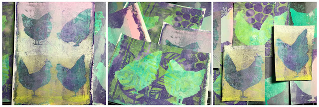 A couple of weeks ago I discovered that I liked the ease of cutting Grafix Dura-Lar Wet Media Film for a stencil I had created. The film cuts really well with both scissors and a hobby blade. The durability of the film was appealing to me so I created my chicken masks from it as well by tracing sketches I had made of our girls. After I had used them, I realized that the masks could also be used later as an image attached to a card or collage. For now, I'll keep it in my stencils and masking supplies for printing.