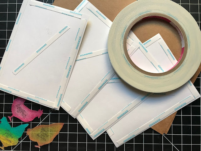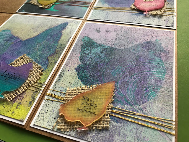 After I was happy with the few backgrounds I had created, and long after they had time to dry, I cut them up. If you know me, you know I love to create one big panel and reduce it to create several cards from it. I knew in the beginning I would be quartering the panels which is why my chickens were sized and placed where they were.