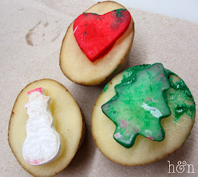 Here's a little something for your handmade holiday. Let the kids make their own Potato Stamp Gift Wrap (with your help) by cutting a potato in half, pressing a cookie or fondant cutter into the potato half, and cutting away the excess with a paring knife. It's a great way to recycle newsprint and paper grocery bags, too!