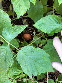 Penny... you naughty girl! We have recently fenced off the garden area because chickens are REALLY GOOD at scratching and digging for bugs and worms... and as a result, generally ruin a garden. I discovered this gem hiding within the raspberry bushes while watering.