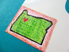I used my From Oregon, With Love stamp and inked the outline only, then colored the design with colored pencil.  It looks REALLY rough!  I liked how my tide pool postage stamp style design turned out the other day so I cut this image the same way using a pair of decorative edged scissors.